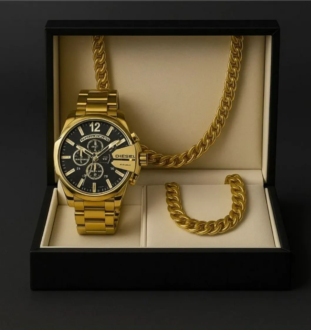 ست ساعت دیزل مردانه به همراه گردنبند و دستبند استیل طلایی رنگ ثابت، ساعت مچی مردانه استیل طلایی با بند و بدنه مقاوم، مناسب استایل رسمی، اداری و اسپرت. همراه با نیم ست گردنبند و دستبند طلایی رنگ ثابت، یک انتخاب شیک و ماندگار برای شما.